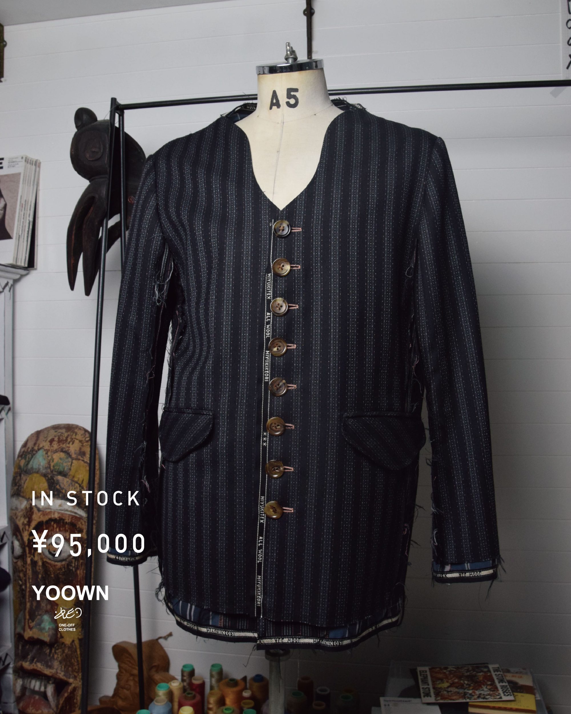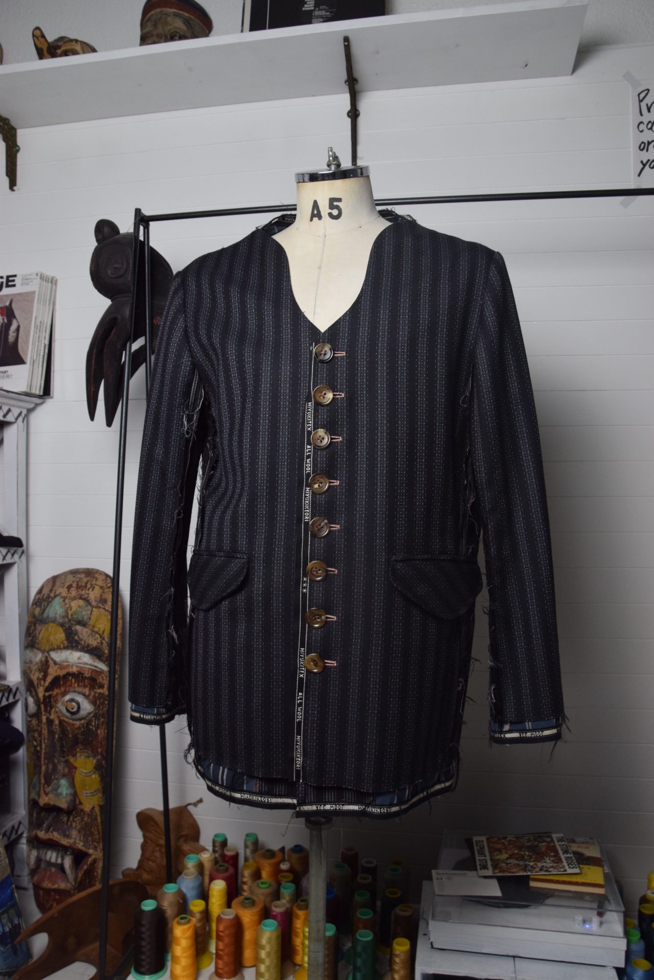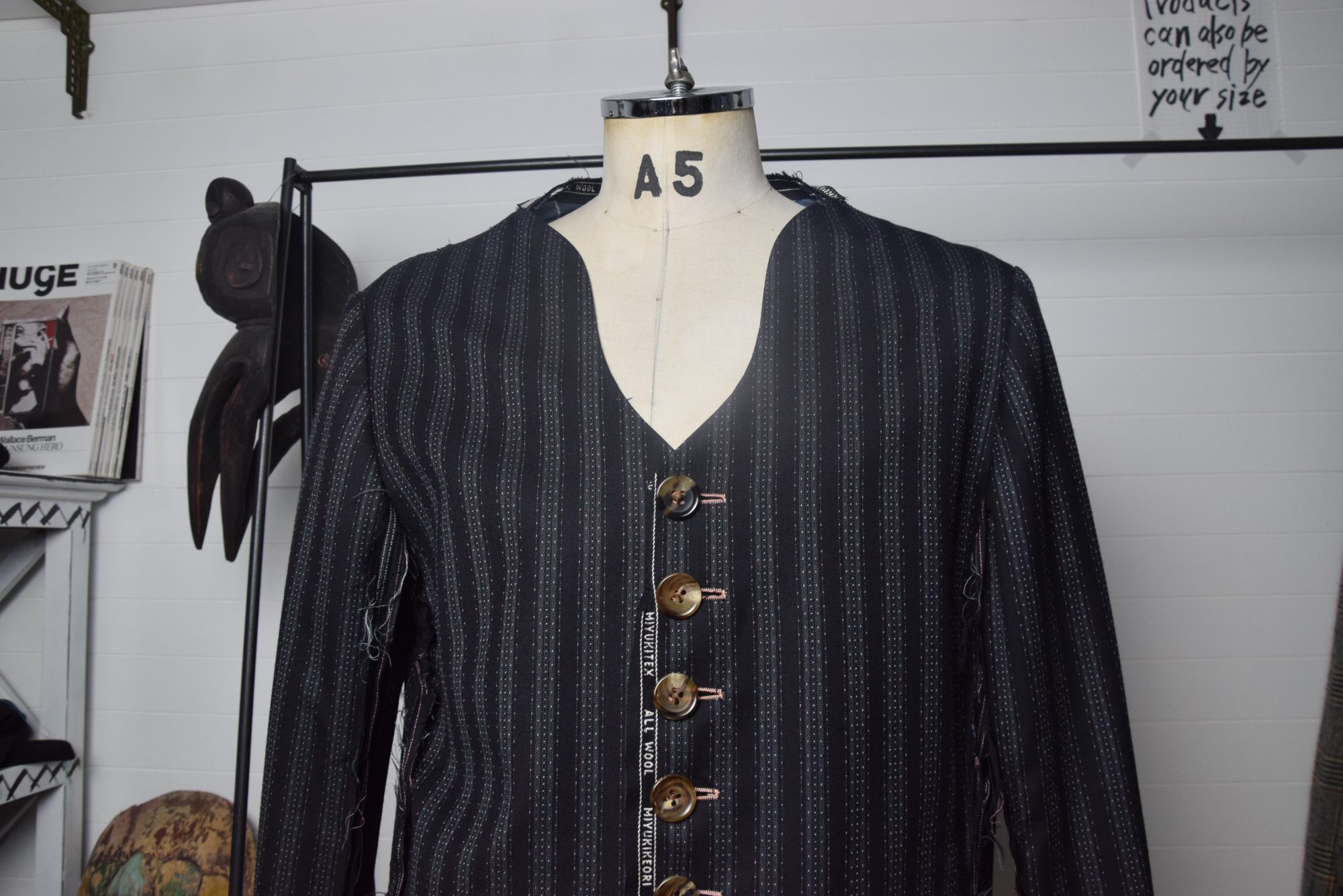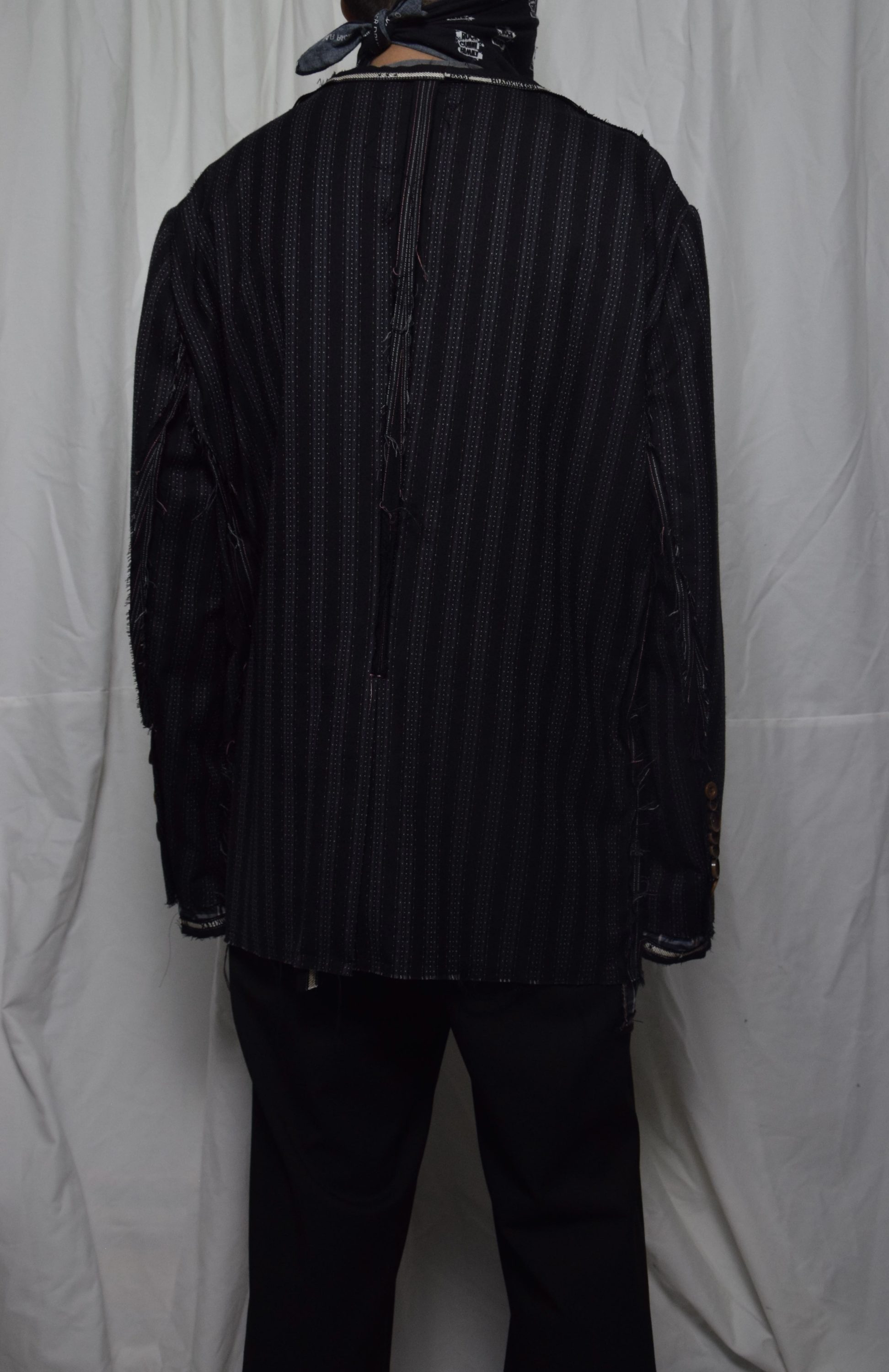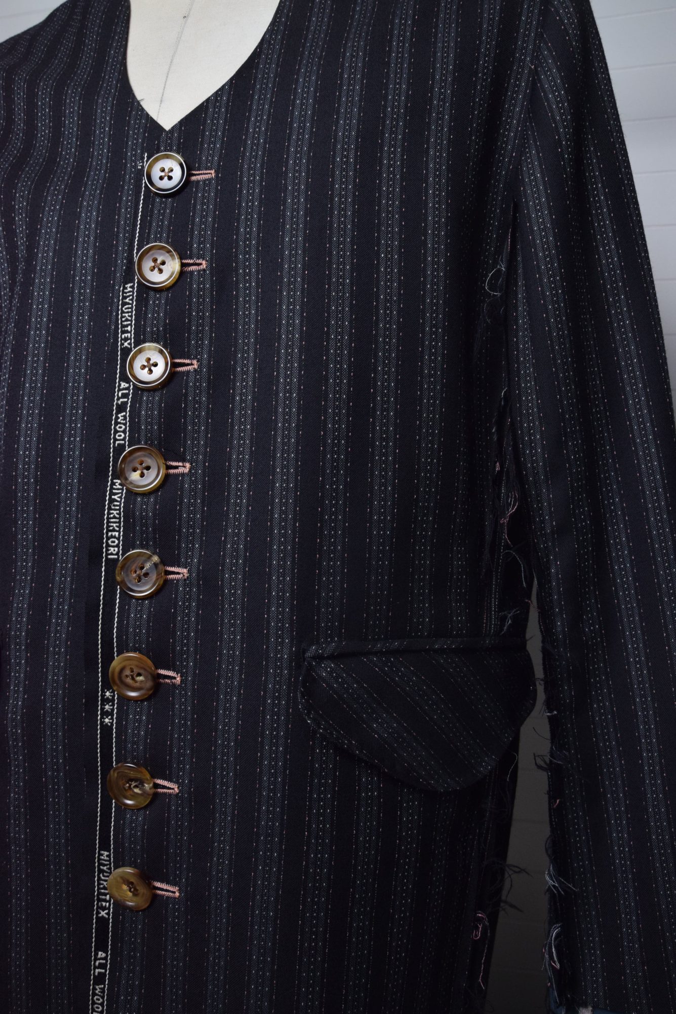 Collarless jacket with fabric selvage(mimi) in various places.